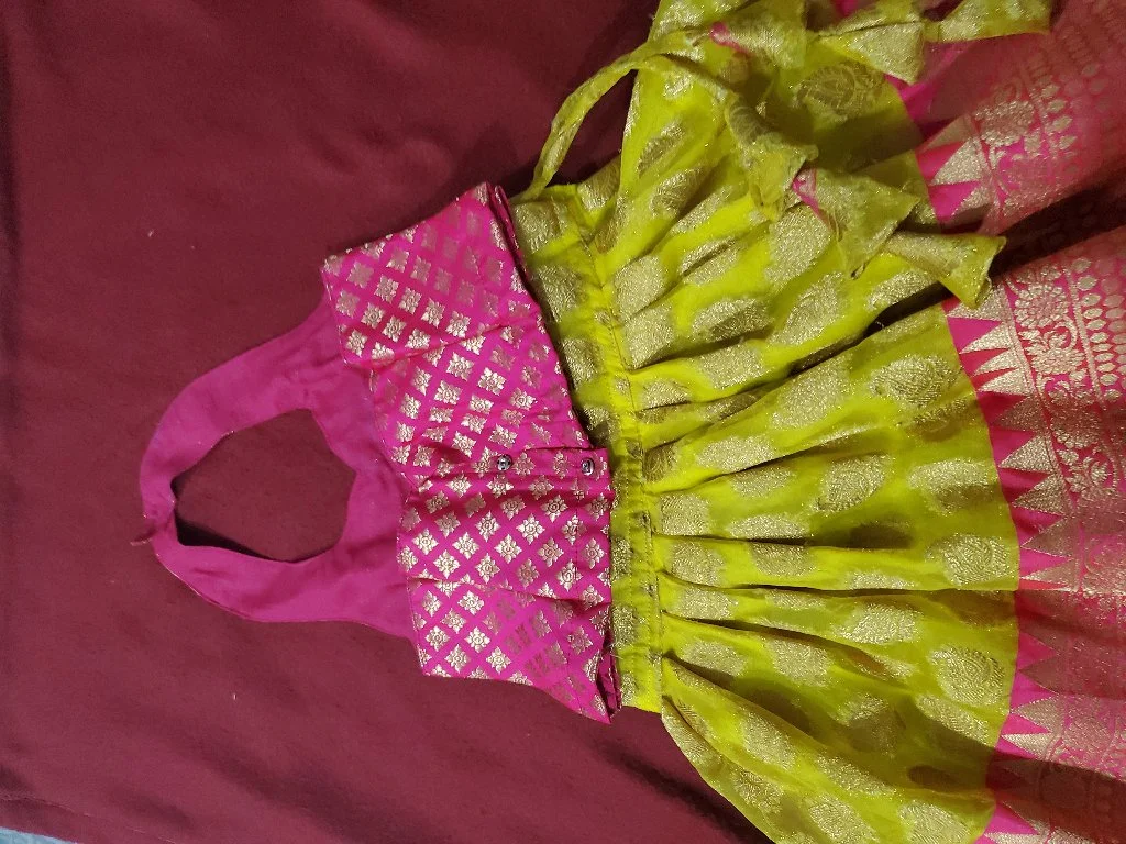 Purple Floral Organza Saree with Pink Zari Blouse • Lemon Yellow With Pink Boarder Semi Organza Kids Fancy Lehanga.